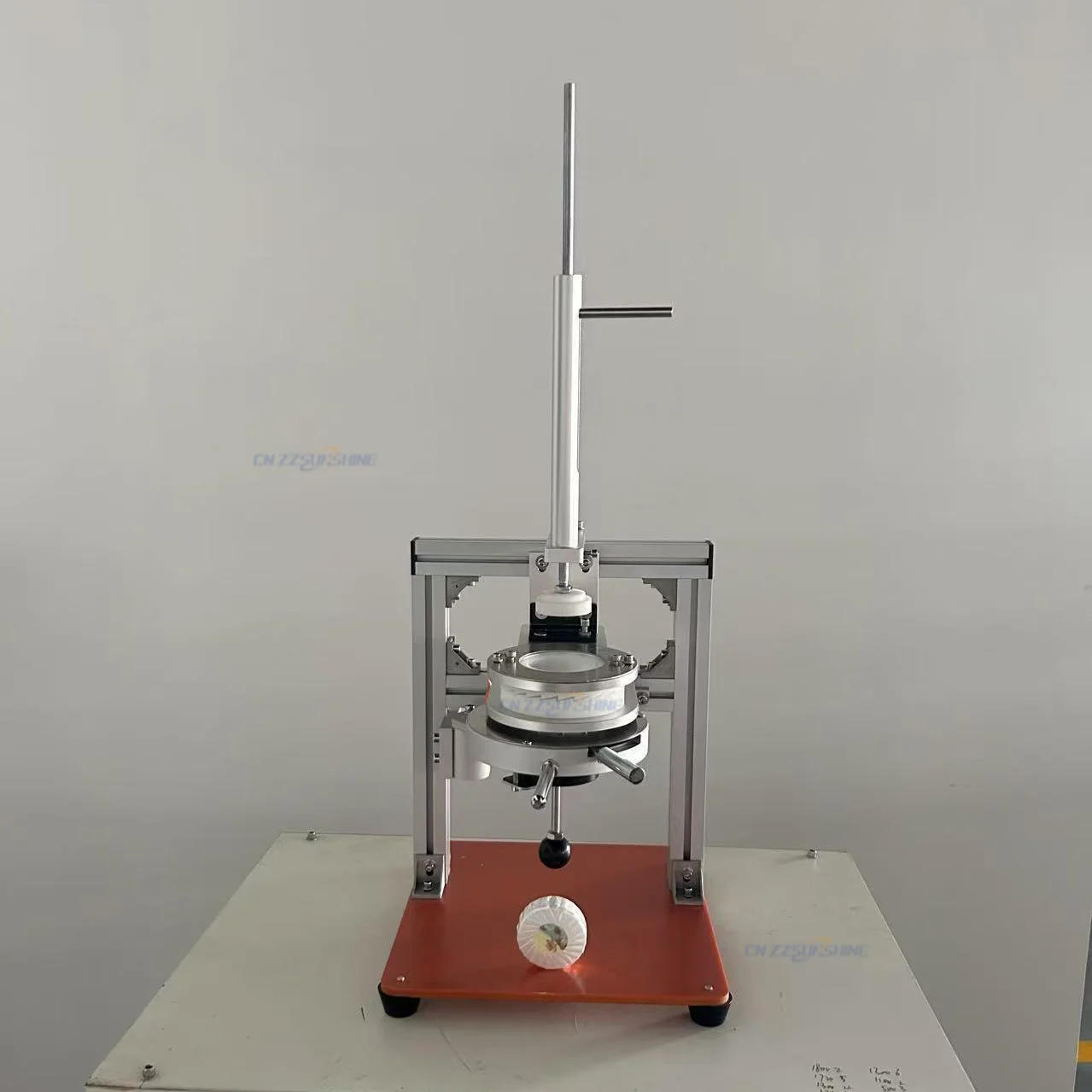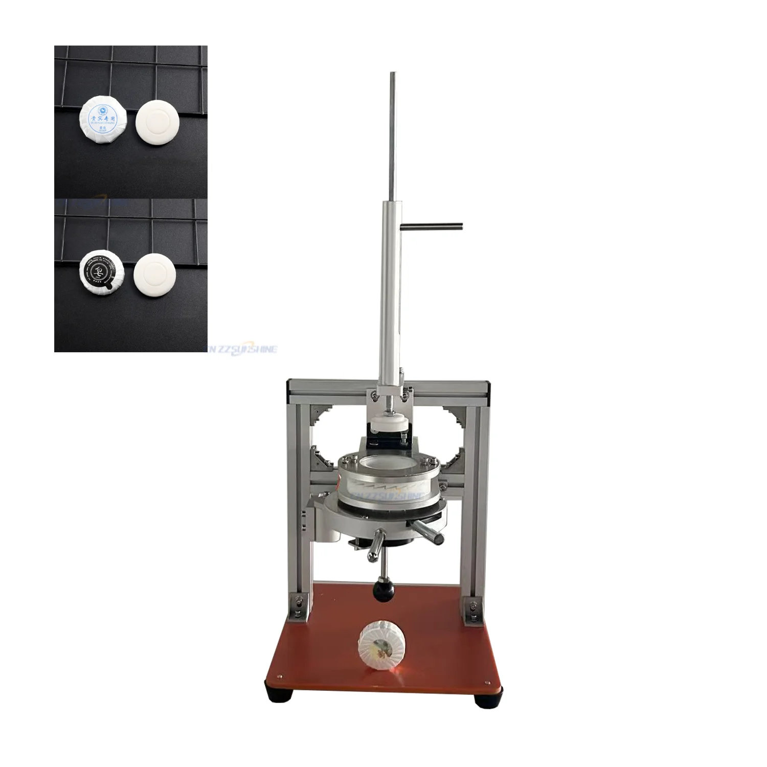 The manual packaging equipment supports circular soap packaging, including tray wrap, transparent film, replaceable molds, and supports paper/PVC label labeling